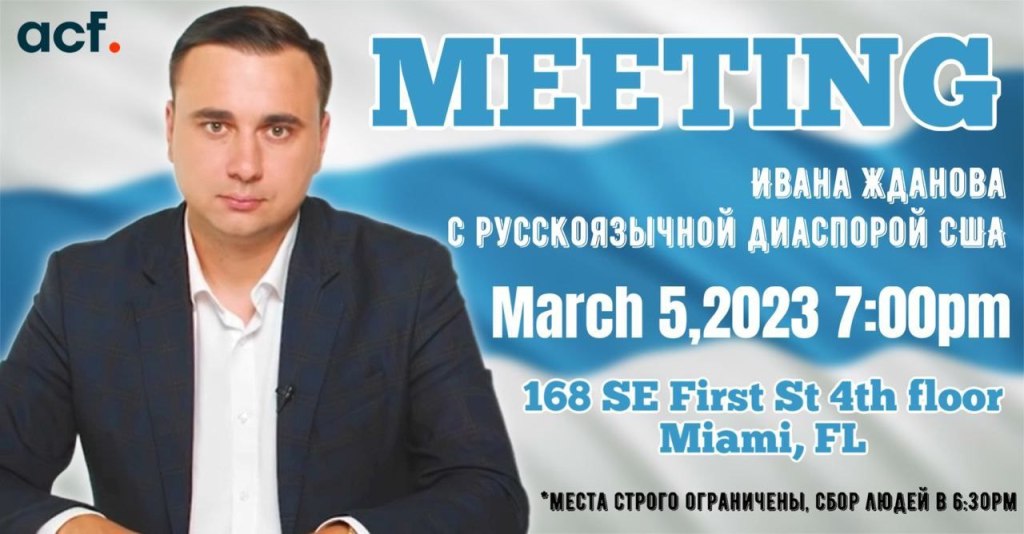 5 марта 2023 года состоиться встреча Ивана Жданова с русскоязычной диаспорой США в Майами. 21 февраля 20237 марта 2023alekseinikolskii РЕГИСТРАЦИЯ ОБЯЗАТЕЛЬНА! https://www.eventbrite.com/e/558078446657 Мероприятие в Фейсбуке https://fb.me/e/2typ3Xlgk Поделиться ссылкой: Поделиться в Х (Открывается в новом окне) X Поделиться на Facebook (Открывается в новом окне) Facebook Поделиться в Telegram (Открывается в новом окне) Telegram Поделиться в WhatsApp (Открывается в новом окне) WhatsApp Нравится Загрузка... Похожее