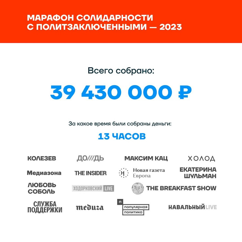 12 июня 2023 года наши медиа были организаторами и участниками марафона солидарности с политзаключенными. Крупнейшие каналы объединились, чтобы собрать деньги на поддержку тех, кто подвергся репрессиям со стороны путинской власти.