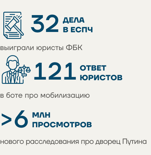 Еще наши юристы выиграли 32 дела в ЕСПЧ — в основном по задержаниям на зимних митингах 2021 года за свободу Навального. Также они работают над алгоритмом реализации тех решений ЕСПЧ, которые отказались исполнять власти России в странах Европы, — чтобы все пострадавшие получили свои законные выплаты.